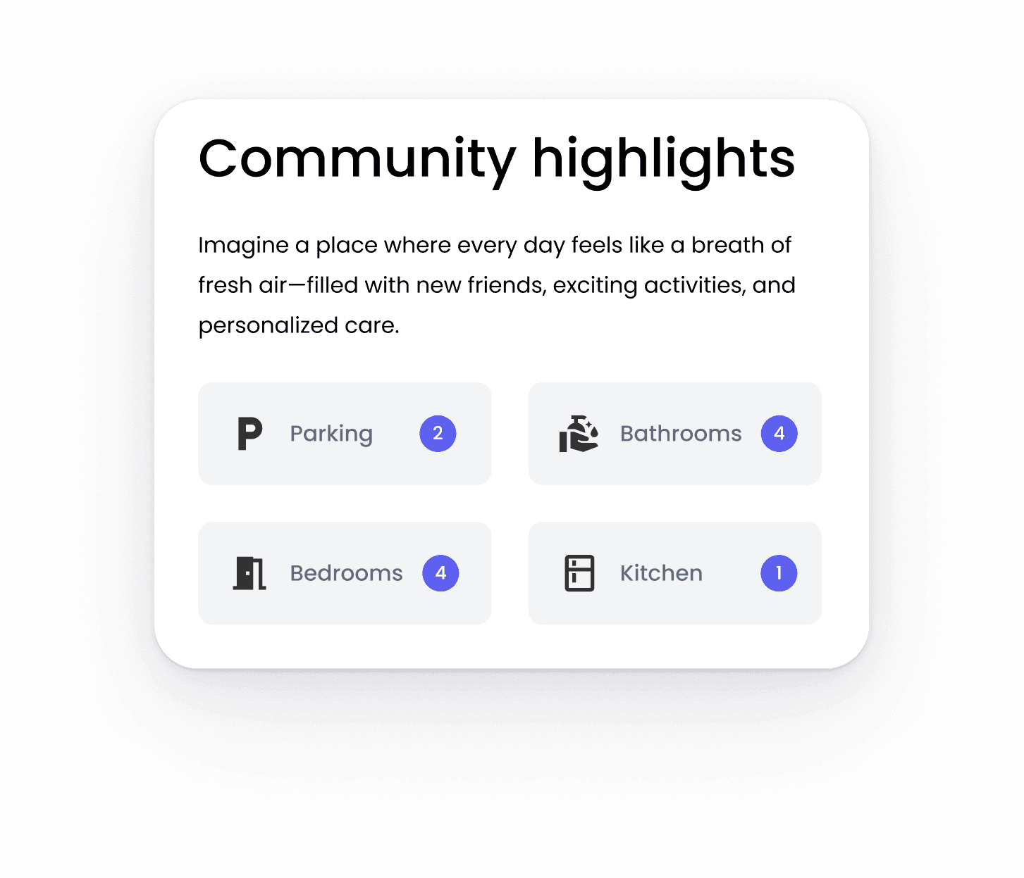 From discovery to decision, the Community Highlight Page brings together video, reviews, floor plans, and scheduling. Powered by AVA.